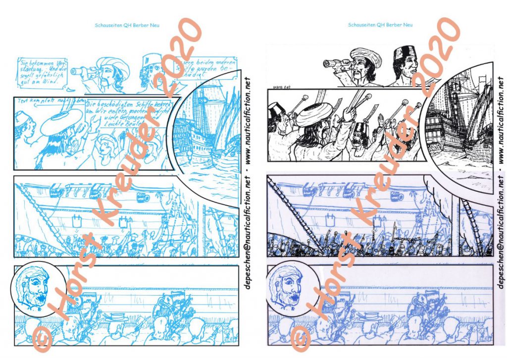 Für diesen Lagebericht habe ich die Seite 8 unten mal gescannt statt fotografiert und mit dem fertigen Teil zusammen montiert. So bekommt Ihr einen Eindruck, wie weit die Seite als Ganzes ist. 🙂